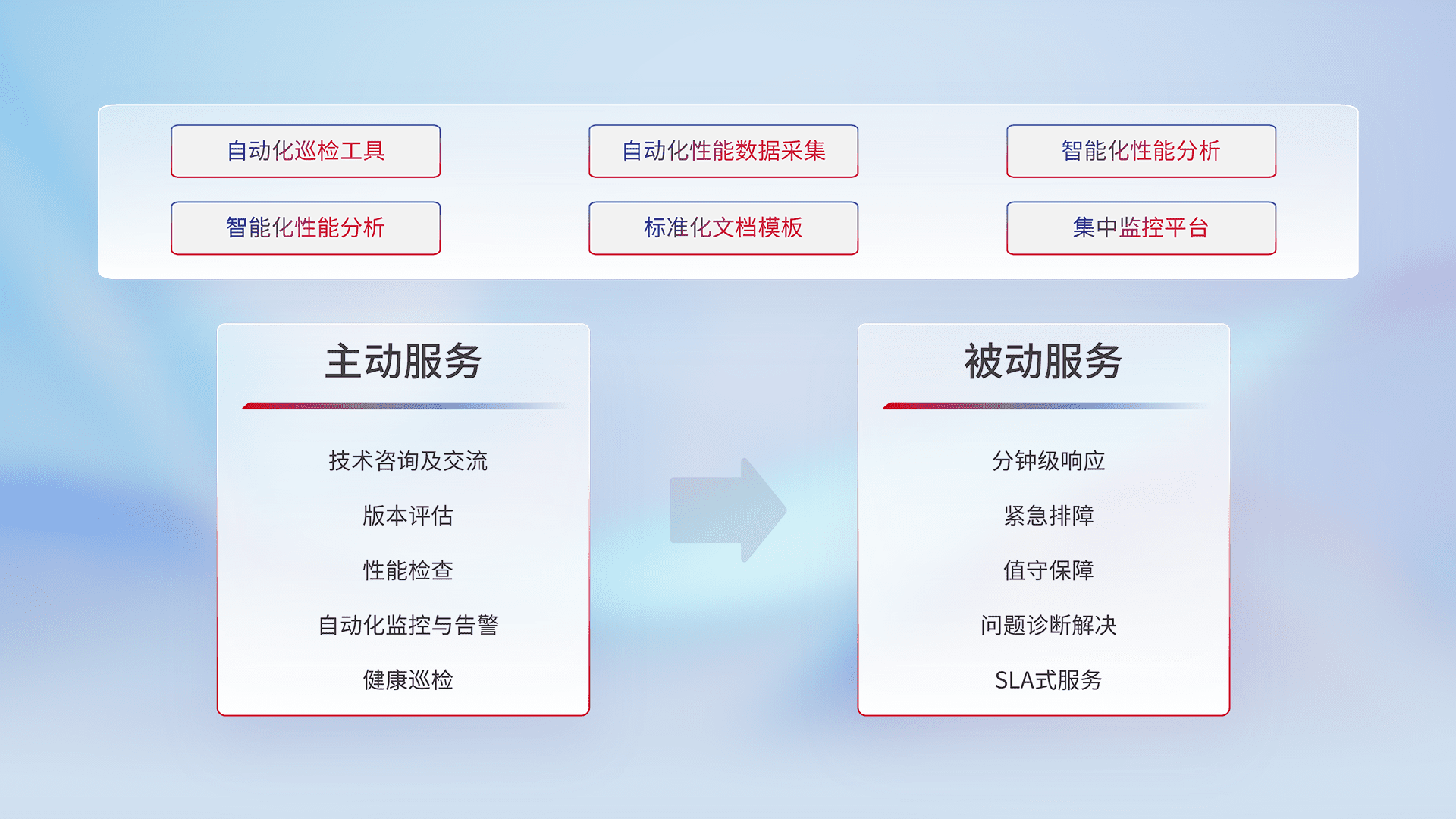 智能化工具和标准化文档,,保障服务质量,,,提供主动服务(包含技术咨询、、、、版本评估、、性能检查、、自动化监控与告警、、、健康巡检)和被动服务包含(分钟级响应、、、紧急排障、、、、值守保障、、、、问题诊断解决、、SLA服务)。。
